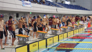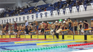 10名1チームで泳ぎ、第1泳者は50m、第2泳者~第9泳者は25m、第10泳者は50mの計300mを競います。